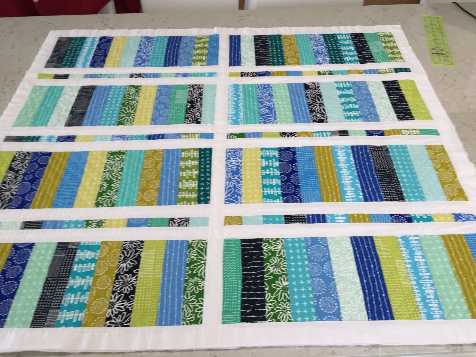 That wasn’t too bad. It took me two mornings, but I wasn’t in any hurry. This morning I put together the binding strips, ironed and clipped to the quilt.