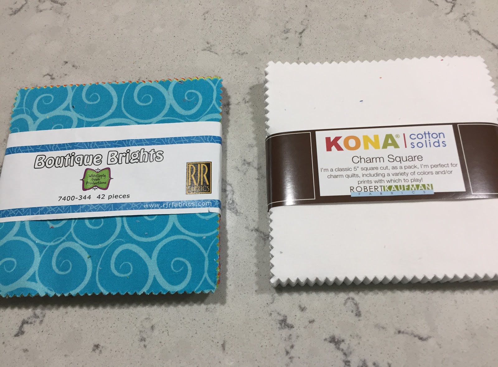 After I finished my Sew Together Bag, I was looking for a quick quilt project. So I pulled this fabric from the bin. They are charm packs Kona Cotton Solids in White and Boutique Brights from RJR.