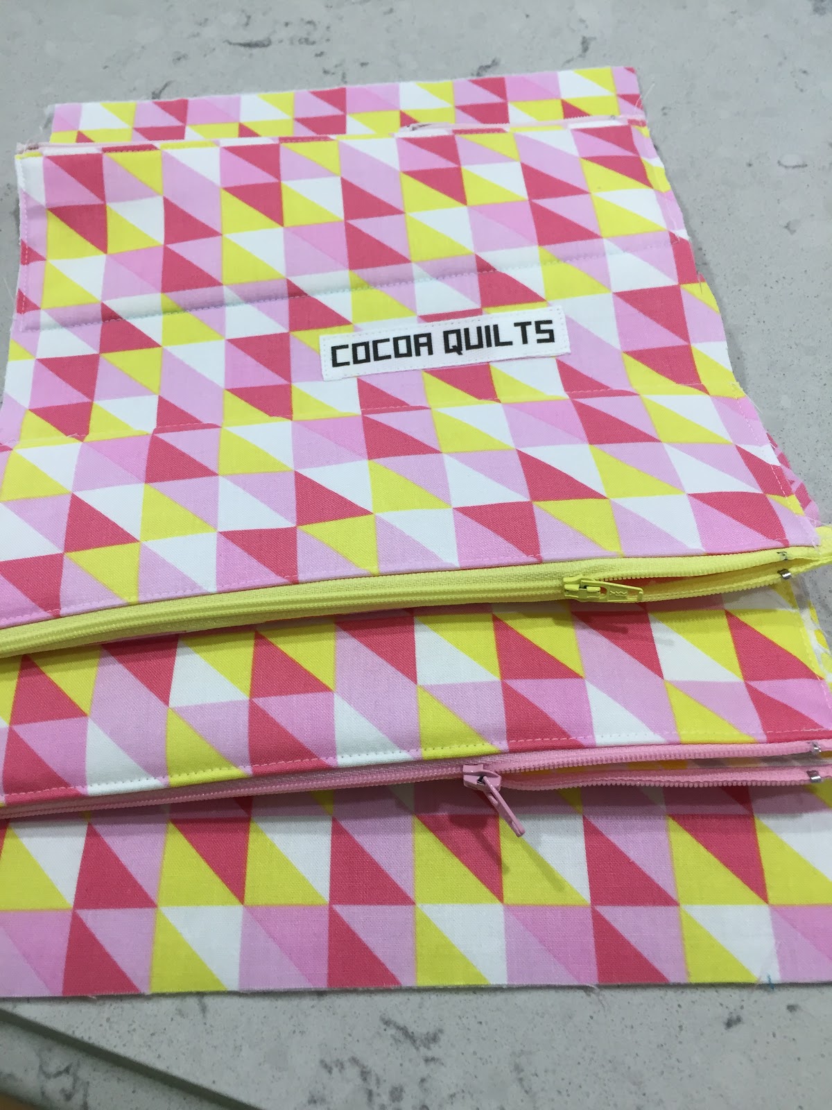 Here is my bag about half done.  I even remembered to label it.  I used 2 shades of pink zippers and a yellow on the inside pockets.
